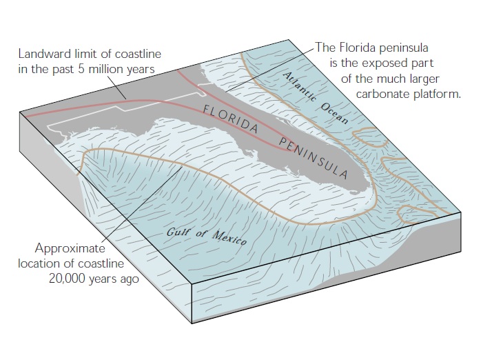 During the last glacial stage — 20,000 years ago — the peninsula’s land mass was nearly doubled. This connected Florida to the American southwest and narrowed the Gulf of Mexico. Conditions throughout Florida were drier, allowing arid plants and animals to survive.